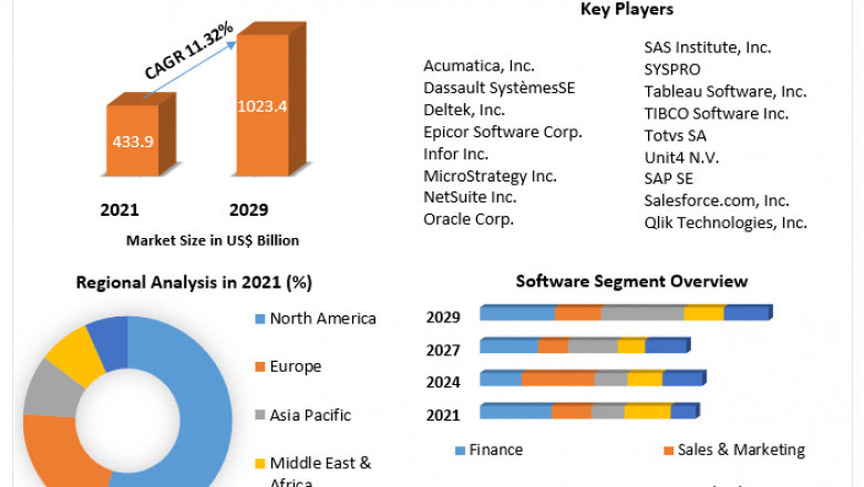 Business Software and Services Market size was valued at US$ 433.99 Bn. in 2021 and the total revenue is expected to grow at 11.32% through 2021 to 2029, reaching nearly US$ 1023.4 Bn.