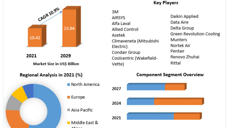 Data Center Cooling Market size was valued at US$ 10.42 Bn. in 2021 and the total revenue is expected to grow at a CAGR of 10.9% through 2021 to 2029, reaching nearly US$ 23.84 Bn.