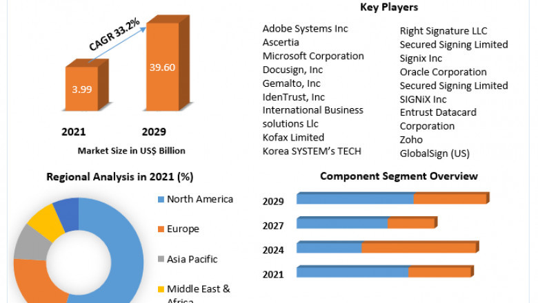 Digital Signature Market size was valued at US$ 3.99 Bn. in 2021 and the total revenue is expected to grow at 33.2 % through 2021 to 2029, reaching nearly US$ 39.60 Bn.