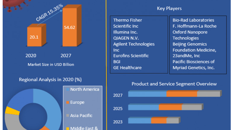 Genomics Market was worth US$ 20.1 Bn. in 2020 and total revenue is expected to grow at a rate of 15.35 % CAGR from 2021 to 2027, reaching almost US$ 54.62 Bn. in 2027.