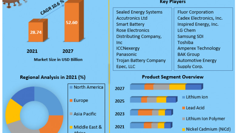 Smart Battery Market size was valued at US$ 28.74 Bn. in 2021 and the total Smart Battery revenue is expected to grow at 10.6 % through 2022 to 2027, reaching nearly US$ 52.60 Bn.
