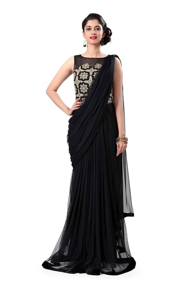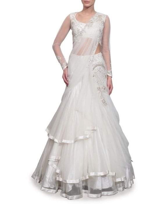 Saree gown is latest trend for wedding and party wear dress. it look like saree style gown and stitched saree gown, now a days every one wants to wear light weight dress but look like heavy so you can try saree gown that is perfect dress for special occasion.