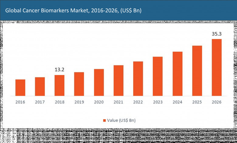 The Cancer Biomarkers Market size was valued at US$ 13.2 Bn in 2018 and is expected to grow at a compound annual growth rate (CAGR) of 13.1% for the forecast period ending 2026 reaching a Market value of US$ 35.3 Bn.