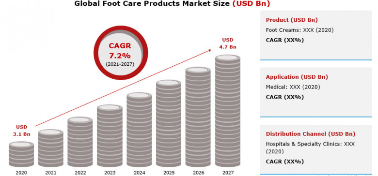 “The Foot Care Products Market size was valued at US$ 3.1 Bn in 2020 and is expected to grow at a compound annual growth rate (CAGR) of 7.2% for the forecast period ending 2027 reaching a Market value of US$ 4.7 Bn.”