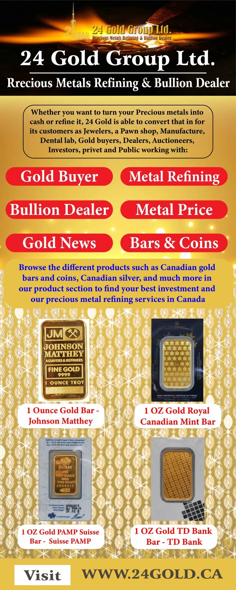24 Gold Group is a Precious Metal Refining & Bullion Dealer company in Canada. We buy and sell metal products like Gold, Silver, Platinum, Palladium, Bullion, Bars, Coins, and Wafers, etc. Browse the different products such as Canadian gold bars and coins, Canadian silver, and much more in our product section or contact us at +1 (855) 214 2442 or visit our website