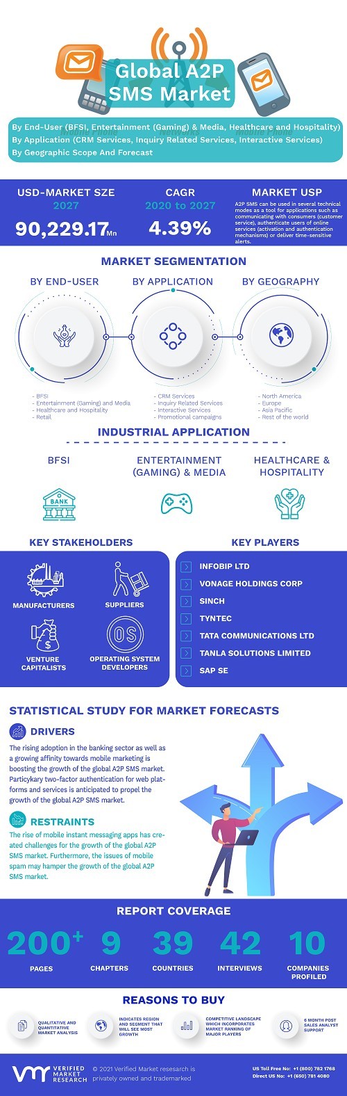 News A2P SMS Market Size By Application ), By Geographic Scope And Forecast smithjenny22119 1,238 views A2P SMS Market was valued at USD 64,110.88 Million in 2019 and is projected to reach USD 90,229.17 Million by 2027, growing at a CAGR of 4.39% from 2020 to 2027. « Previous A2P SMS Market