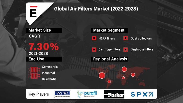 The global Air Filters Market was valued at USD 12.36 billion in 2021. The market is projected to grow to USD 20.3 billion in 2028 at a CAGR of 7.30%. The rise in CAGR is due to the rise in demand which is projected to return to the pre-pandemic levels once we overcome the COVID-19 pandemic. Air filters are vital in removing minute particulates from internal combustion engines with help of heating, ventilation, and air-conditioning systems. Moreover, air filters are also used extensively in air-moving devices such as air handlers, fan coils, and terminal devices. In addition, these filters are crucial part of air purifiers which have been used extensively to maintain clean air circulation.