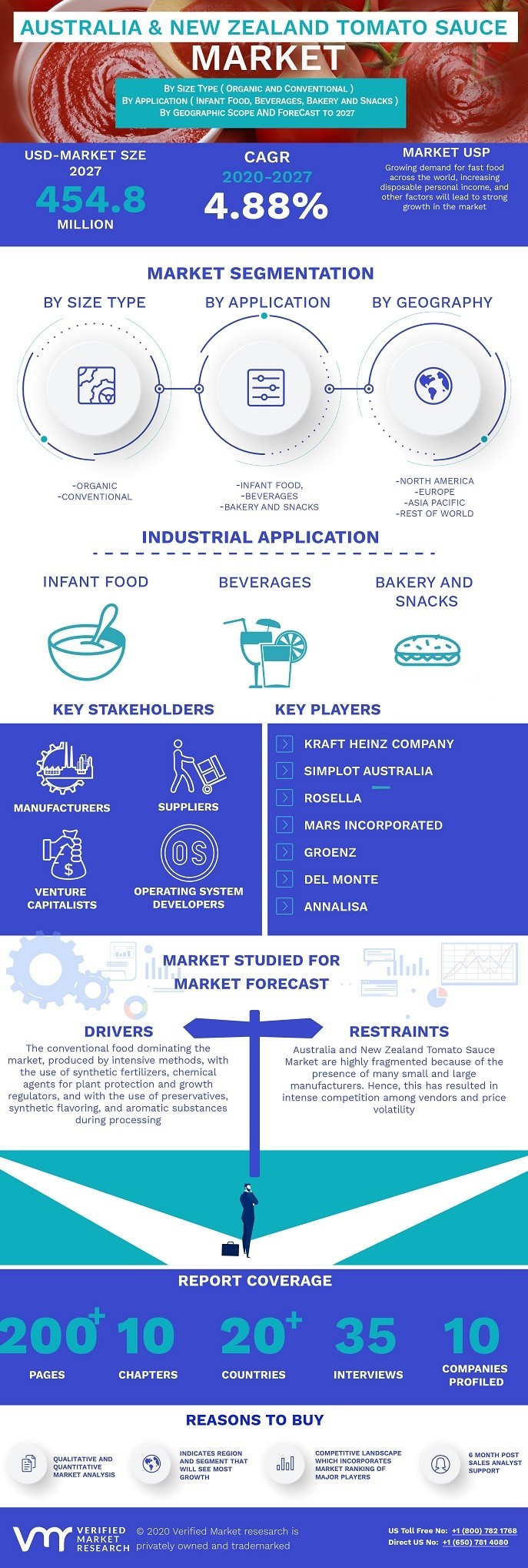 Australia & New Zealand Tomato Sauce Market was valued at USD 317.4 Million in 2019 and is projected to reach USD 454.8 Million by 2027, growing at a CAGR of 4.88% from 2020 to 2027.
