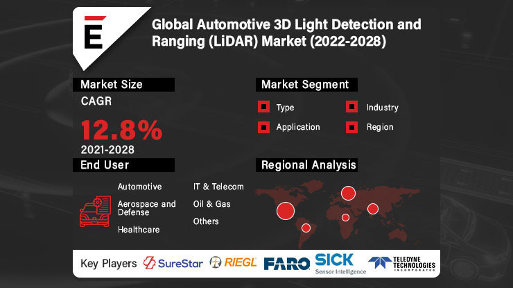 The global Automotive 3d Light Detection and Ranging (LiDAR) Market is projected to grow from USD 750.3 million in 2021 to USD 1860.6 million by 2028 at a CAGR of 12.8% during the forecast period. The growing demand for 3D imagery in a variety of applications, including topographical surveys, military and defense, and civil engineering, is expected to drive the market forward. Textured 3D imagery is utilized in 3D mapping, corridor mapping, city planning, and other applications. The number of enhanced safety features being installed is growing at an exponential rate. In countries such as the United States, self-driving cars utilizing LiDAR for GPS and navigation have been certified by the government.
