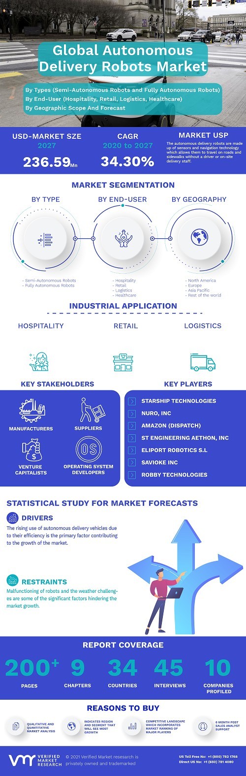 Autonomous Delivery Robots Market was valued at USD 24.30 Million in 2019 and is projected to reach USD 236.59 Million by 2027, growing at a CAGR of 34.30% from 2020 to 2027.