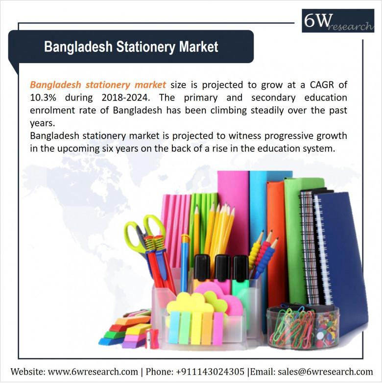 According to 6Wresearch, Bangladesh stationery market size is projected to grow at a CAGR of 10.3% during 2018-2024. The primary and secondary education enrolment rate of Bangladesh has been climbing steadily over the past years. Therefore, a significant portion of the demand for stationery items comes from the education sector in the country. Further, the growing e-commerce industry is also providing new avenues for the distribution of stationery products to end consumers. Increasing development in the commercial sector coupled with rising innovation of products such as the introduction of 3D pens is accelerating the Bangladesh Stationery Market Growth. Rising awareness regarding the importance of education coupled with rising initiatives taken by the government is also adding to the Bangladesh Stationery Market Share.