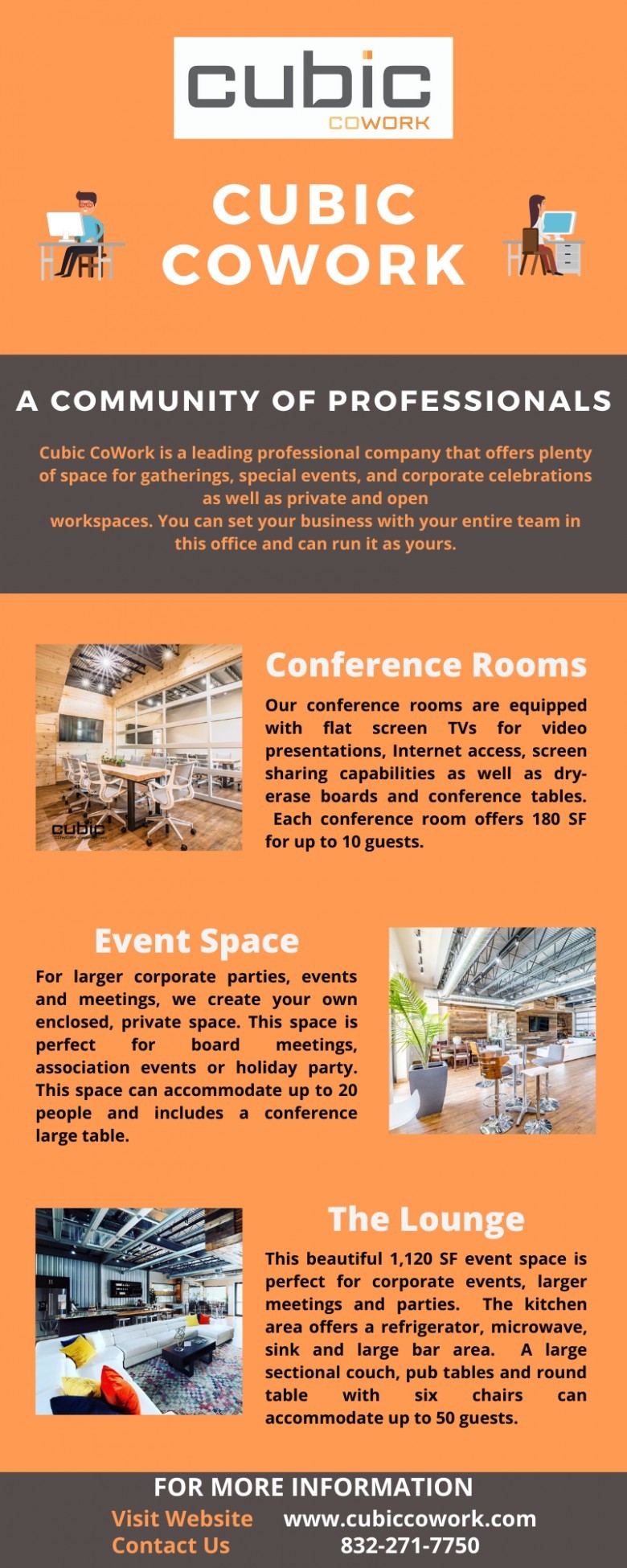 Co-Working is the latest trend in office space in the Woodland where collaboration,creativity, and comfort allows you to work where, when, and how you choose. Itprovides plenty of space for meetings, events, and corporate celebrations aswell as private and open workspaces. Call us for more information:832-271-7750.