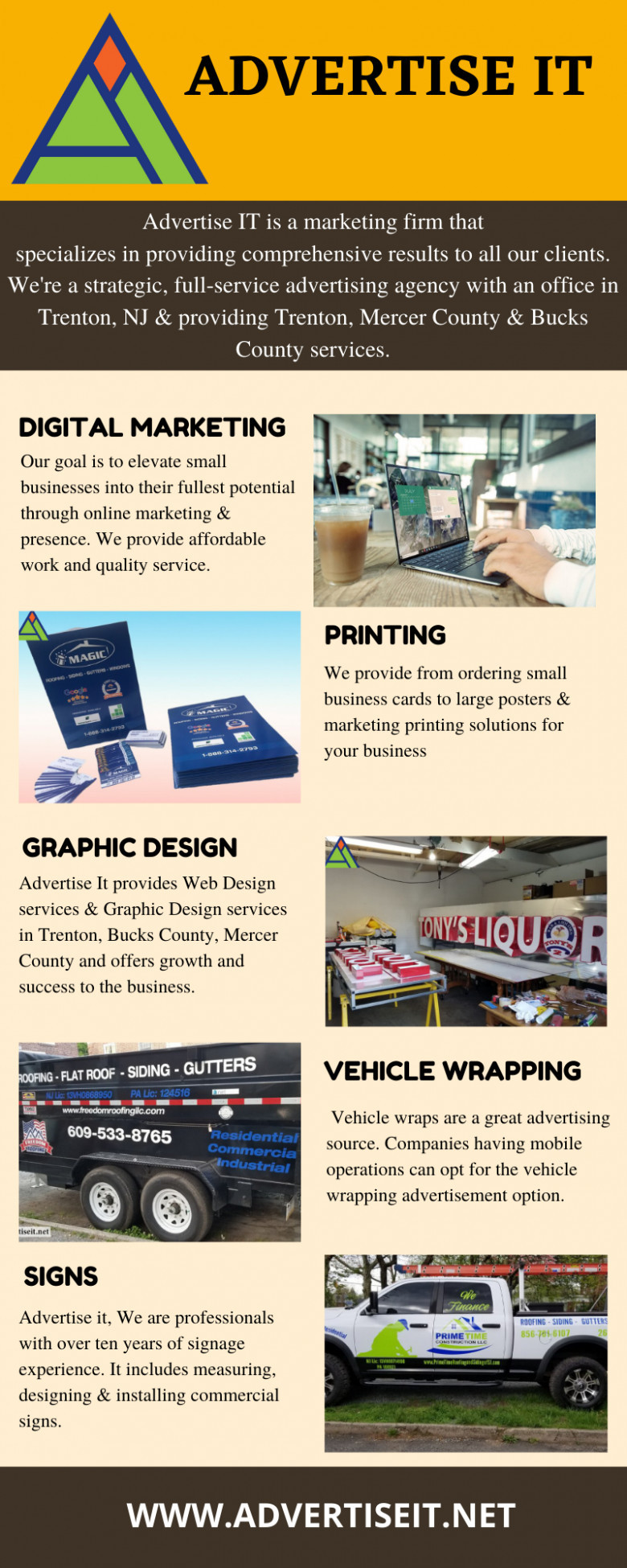 Advertise IT provides distinct and competitive solutions for businesses/brands of any genre. Our team of seasoned digital marketers has distilled and quick ways to make you a dominating brand in your respective market. Our goal is to elevate small businesses to their fullest potential through online marketing & presence. For more information, contact us at 609-200-6555 .