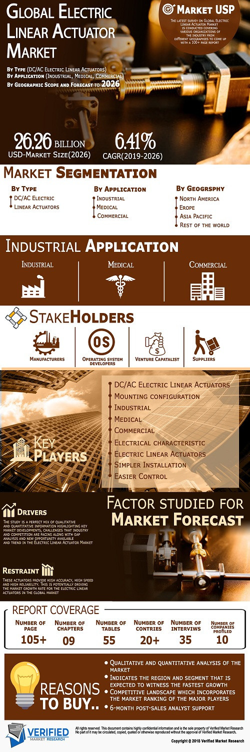 News Electric Linear Actuator Market By Type (DC/AC Electric Linear Actuators) By Application (Industrial, Medical, Commercial) smithjenny22119 1,212 views Global Electric Linear Actuator Market was valued at USD 16.13 Billion in 2018 and is expected to witness a growth of 6.41% from 2019-2026 and reach USD 26.26 Billion by 2026. « Previous