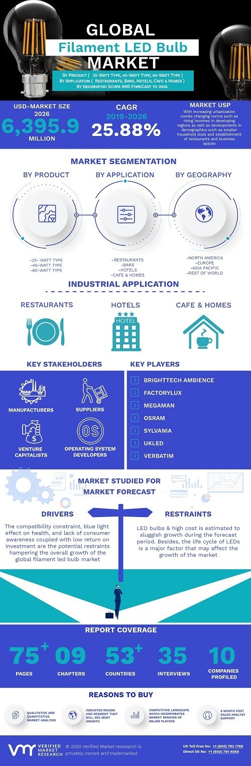 Filament LED Bulb Market was valued at USD 1,063.8 Million in 2018 and is projected to reach USD 6,395.9 Million by 2026, growing at a CAGR of 25.88% from 2019 to 2026.