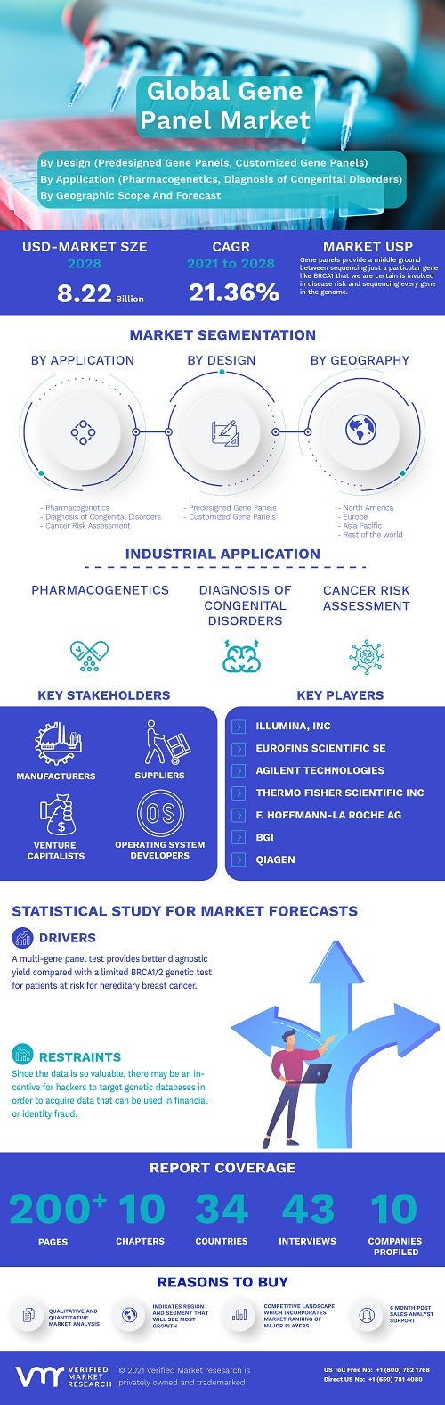 News Gene Panel Market Size By Technique ,By Design, By Application, By Geographic Scope smithjenny22119 1,066 views Global Gene Panel Market was valued at USD 1.70 Billion in 2020 and is projected to reach USD 8.22 Billion by 2028, growing at a CAGR of 21.36% from 2021 to 2028. « Previous Gene Panel Market