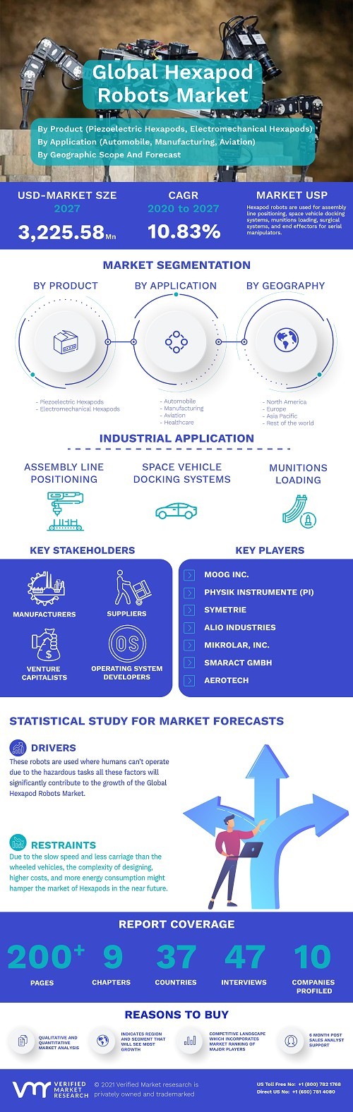 News Hexapod Robots Market Size By Product (Piezoelectric Hexapods, Electromechanical Hexapods), By Application smithjenny22119 2,039 views Hexapod Robots Market was valued at USD 1,630.24 Million in 2019 and is projected to reach USD 3,225.58 Million by 2027, growing at a CAGR of 10.83% from 2020 to 2027. « Previous Hexapod Robots Market Size By Product (Piezoelectric Hexapods Electromechanical Hexapods) By Application