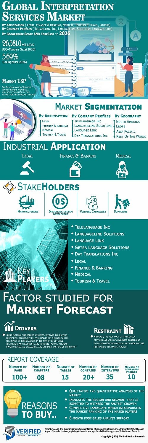 According toVerified Market Research, the Global Interpretation Services Market was valuedat USD 17,230.2 Million in 2018 and is expected to witness a growth of 5.69% from2019-2026 and reach USD 26,581.0Million by 2026.