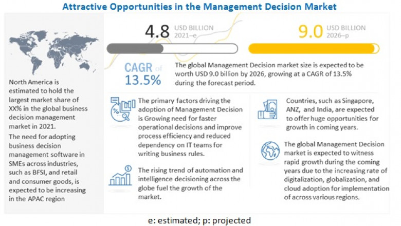 According to market research report "Management Decision Market by Software, Service, Deployment Type, Function (Credit Risk Management, Collection Management, Customer Experience Management), Organization Size, Industry, and Region - Global Forecast to 2026", published by MarketsandMarkets™, the global Management Decision Market size is expected to grow at a Compound Annual Growth Rate (CAGR) of 13.5% during the forecast period, to reach USD 9.0 billion by 2026 from USD 4.8 billion in 2021. Key factors that are expected to drive the growth of the market are the rising need to improve the quality of decisions and achieve business agility with enhanced effectiveness, growing need for faster operational decisions and improve process efficiency, and compelling need to manage regulatory and compliance standards. These factors are driving the demand for management decision.