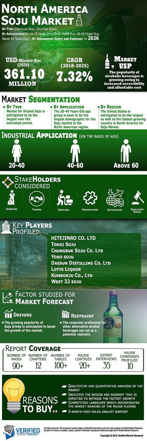 North America Soju Market was valued at USD 207.38 Million in 2018 and is projected to reach USD 361.10 Million by 2026, growing at a CAGR of 7.32% from 2019 to 2026.