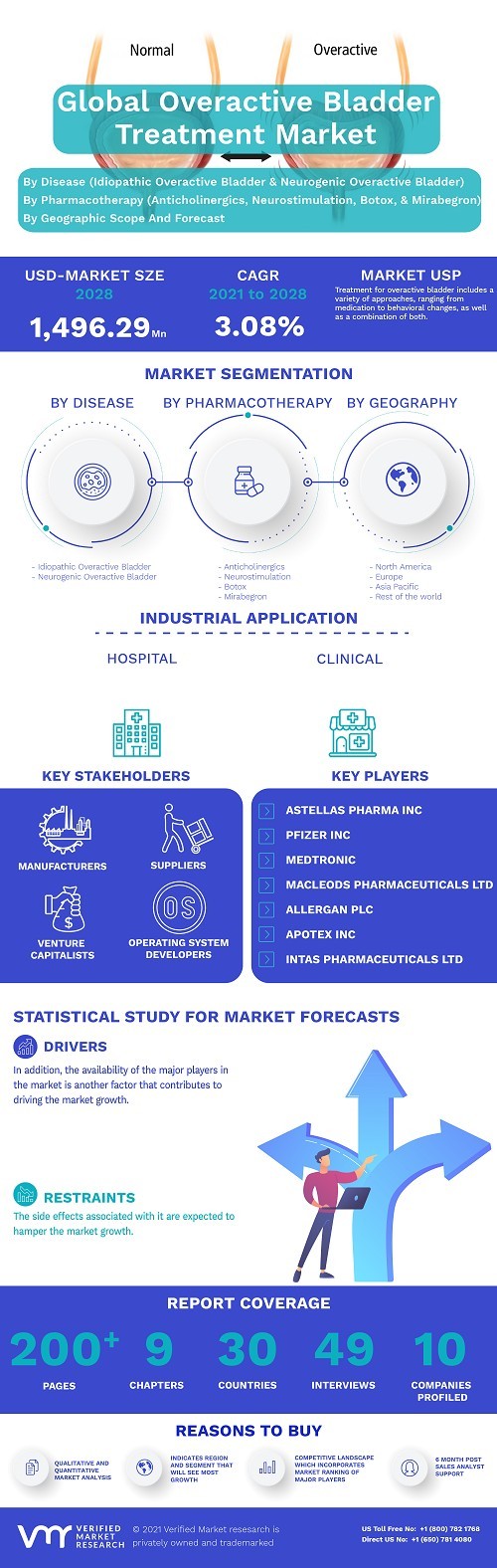 News Overactive Bladder Treatment Market Size By Disease, By Pharmacotherapy, By Geographic Scope And Forecast smithjenny22119 1,294 views Overactive Bladder Treatment Market size was valued at USD 1,192.56 Million in 2020 and is projected to reach USD 1,496.29 Million by 2028, growing at a CAGR of 3.08% from 2021 to 2028. « Previous Overactive Bladder Treatment Market