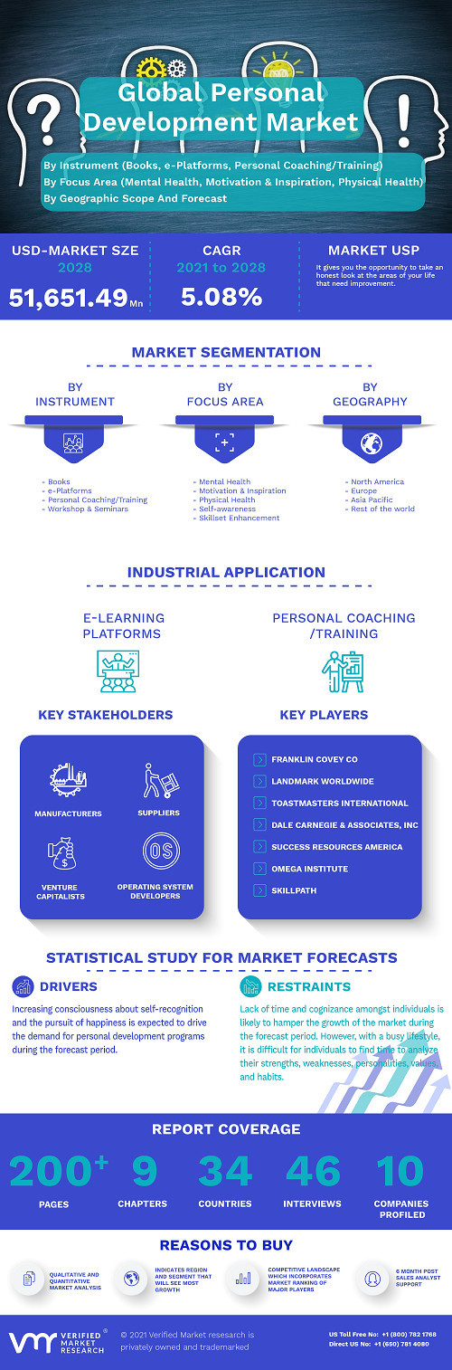 News Personal Development Market Size By Instrument, By Focus Area, By Geographic Scope And Forecast smithjenny22119 525 views Personal Development Market size was valued at USD 35,058.97 Million in 2020 and is projected to reach USD 51,651.49 Million by 2028. « Previous Personal Development Market