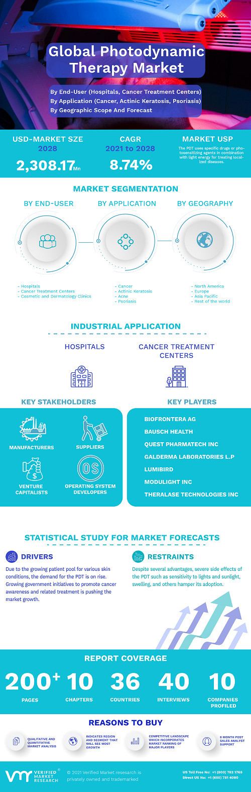 News Photodynamic Therapy Market Size By Product, By Application, By End-User smithjenny22119 1,246 views Photodynamic Therapy Market size was valued at USD 1,230.73 Million in 2020 and is projected to reach USD 2,308.17 Million by 2028. « Previous Photodynamic Therapy Market