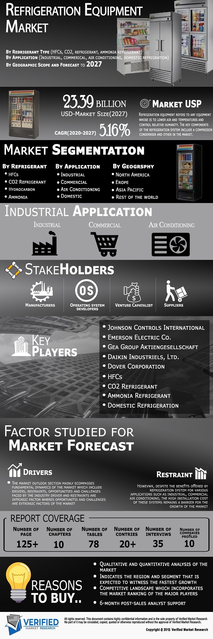 Refrigeration Equipment Market was valued at USD 15.81 Billion in 2019 and is projected to reach USD 23.39 Billion by 2027, growing at a CAGR of 5.16% from 2020 to 2027.