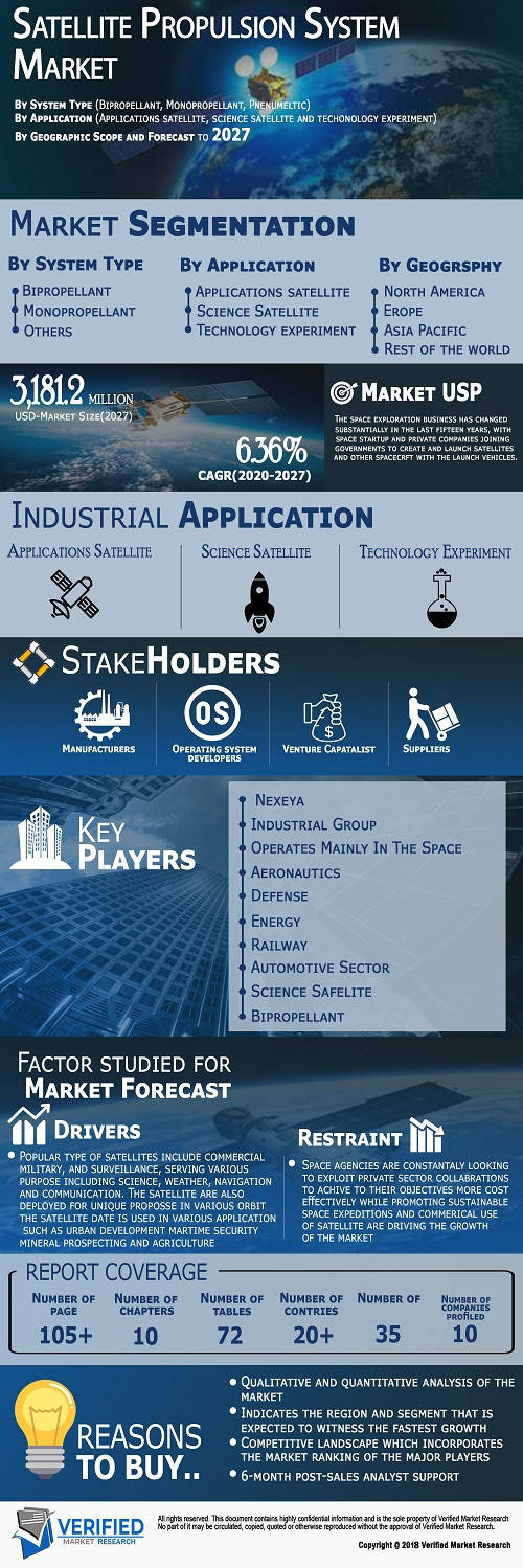 News Satellite Propulsion System Market Size By System Typ, By Application smithjenny22119 1,513 views Satellite Propulsion System Market was valued at USD 1,817.0 Million in 2019 and is projected to reach USD 3,181.2 Million by 2027, growing at a CAGR of 6.36% from 2020 to 2027. « Previous Satellite Propulsion System Market