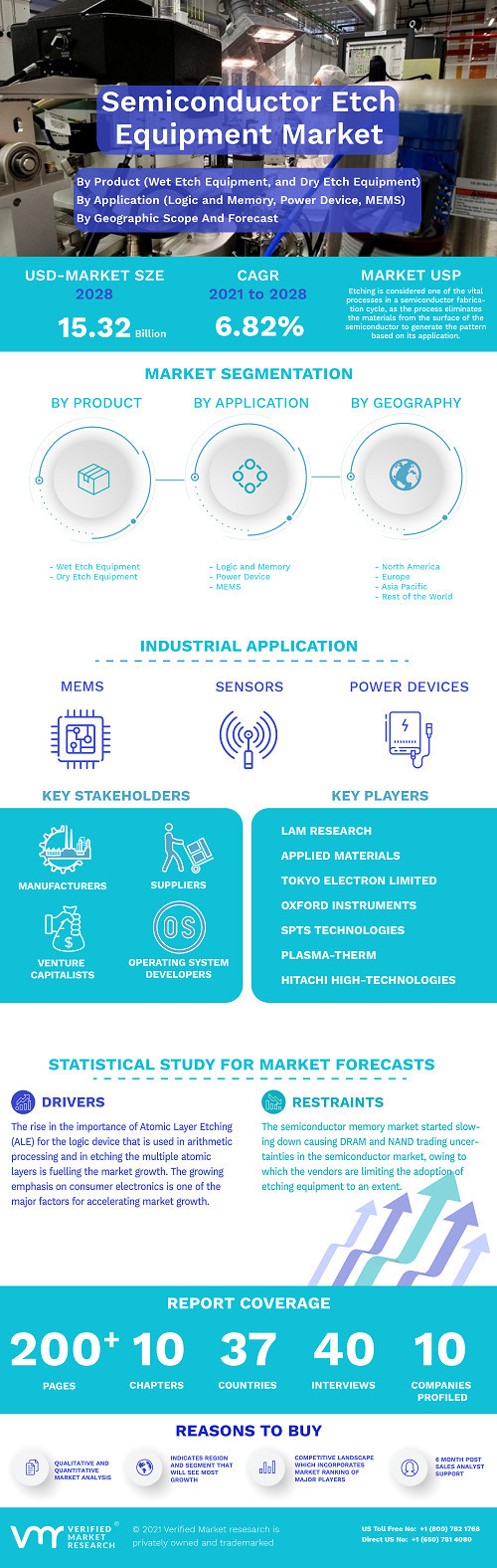 News Semiconductor Etch Equipment Market Size By, By Application (Logic and Memory, Power Device, MEMS), By Geographic Scope And Forecast smithjenny22119 816 views Semiconductor Etch Equipment Market size was valued at USD 9.10 Billion in 2020 and is projected to reach USD 15.32 Billion by 2028. « Previous Semiconductor Etch Equipment Market