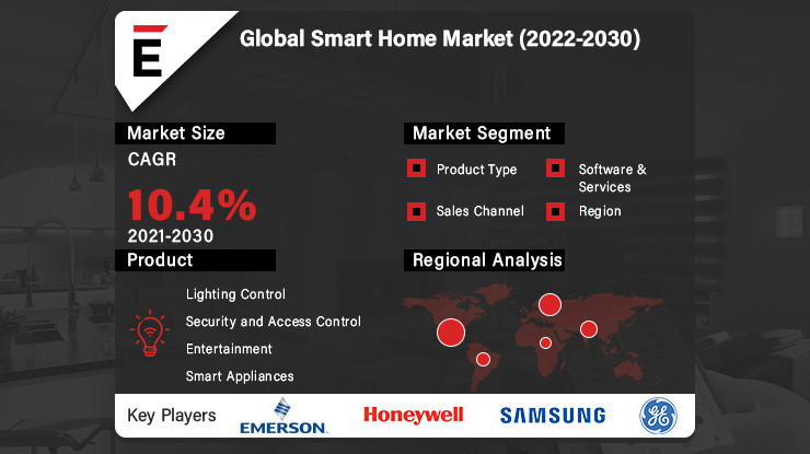 The Global Smart Home Market is projected to grow from USD 84.5 billion in 2021 to USD 163.29 billion by 2030; it is expected to grow at a CAGR of 10.4% during the forecast period. The smart home, also known as home automation, employs internet-connected devices to manage and monitor a variety of home equipment and systems. It is a cutting-edge technology that makes the functioning of a variety of home appliances more convenient and energy efficient. This concept entails employing wireless technology to control all of the electronic equipment in the home. End-users can operate all electronic appliances using a smart home app on their mobile phones or other networked devices, providing comfort, energy efficiency, security, and convenience.