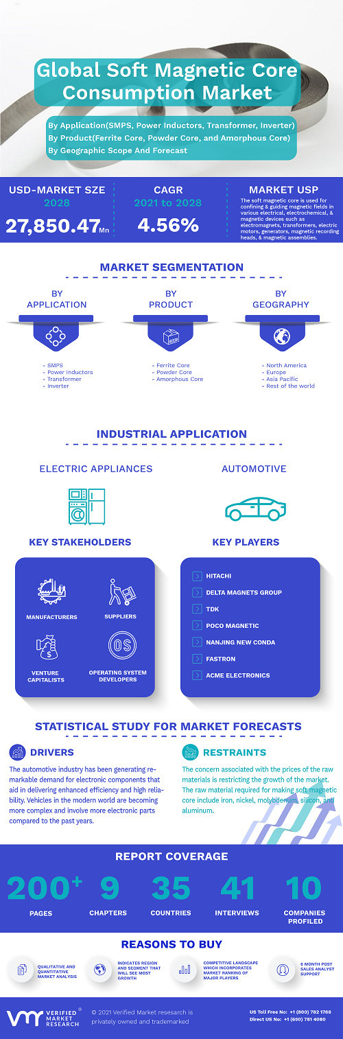 News Soft Magnetic Core Consumption Market Size By Product, By Application, By Geographic Scope And Forecast smithjenny22119 895 views Soft Magnetic Core Consumption Market size was valued at USD 19,701.97 Million in 2020 and is projected to reach USD 27,850.47 Million by 2028. « Previous Soft Magnetic Core Consumption Market