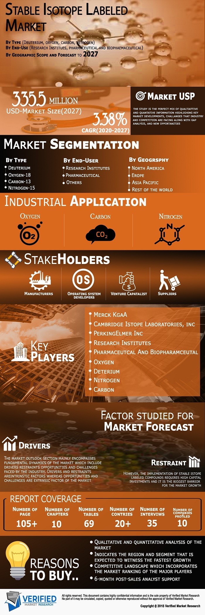 Stable Isotope Labeled Compounds Market was valued at USD 258.2 Million in 2019 and is projected to reach USD 335.5 Million by 2027, growing at a CAGR of 3.38% from 2020 to 2027.