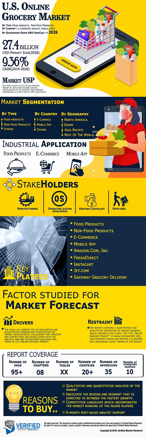 News U.S. Online Grocery Market By Type, By Country smithjenny22119 844 views U.S. Online Grocery Market was valued at USD 19.52 Billion in 2018 and is projected to reach USD 27.4 Billion by 2026, growing at a CAGR of 9.36% from 2019 to 2026. « Previous U.S. Online Grocery Market