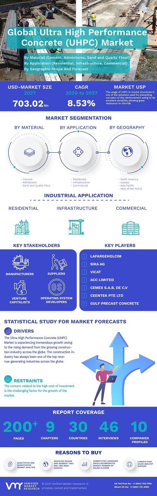 Ultra High Performance Concrete (UHPC) Market was valued at USD 417.63 Million in 2019 and is projected to reach USD 703.02 Million by 2027, growing at a CAGR of 8.53% from 2020 to 2027.