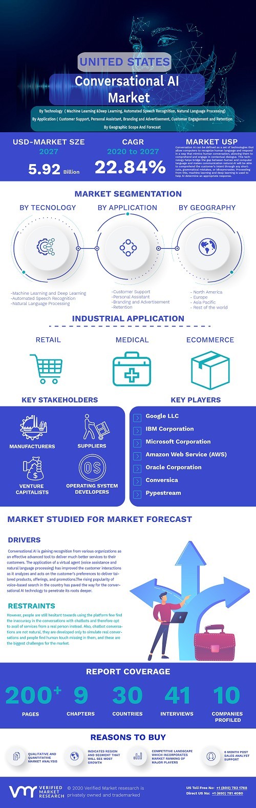 News United States Conversational AI Market Size By Technology, By Application, By Vertical, By Regional Analysis And Forecast smithjenny22119 713 views United States Conversational AI Market was valued at USD 1.12 Billion in 2019 and is projected to reach USD 5.92 Billion by 2027, growing at a CAGR of 22.84% from 2020 to 2027. « Previous United States Conversational AI Market