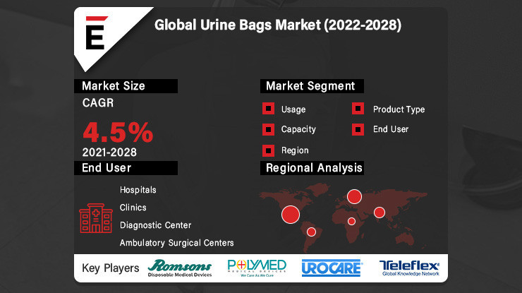 Global Urine Bags Market Size, Share, and COVID-19 Impact Analysis, By Usage (Reusable, Disposable), By Product Type (Leg Bags, Belly Bags, Large Bags & Others), By Capacity (0-500 ml, 501-1000 ml, 1001-2000 ml, more than 2000 ml, Others), By End User (Hospitals, Clinics, Diagnostic Center, Ambulatory Surgical Centers, Home Care, Others) and by Region (North America, Europe, Asia-Pacific, Latin America, Middle East and Africa) Analysis and Forecast 2022-2028