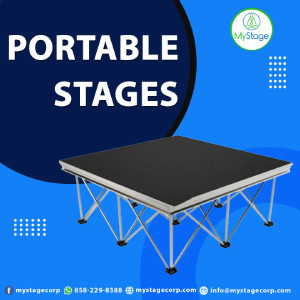 Made from high-grade Aluminum, MyStage portable stages are and with railing also. The multipurpose DIY staging solution is designed with a 5th leg in the center to reduce deflection or bounce. Each 4’ x 4’ deck can be folded in half to 2’x 4’ for convenient transporting and storage.