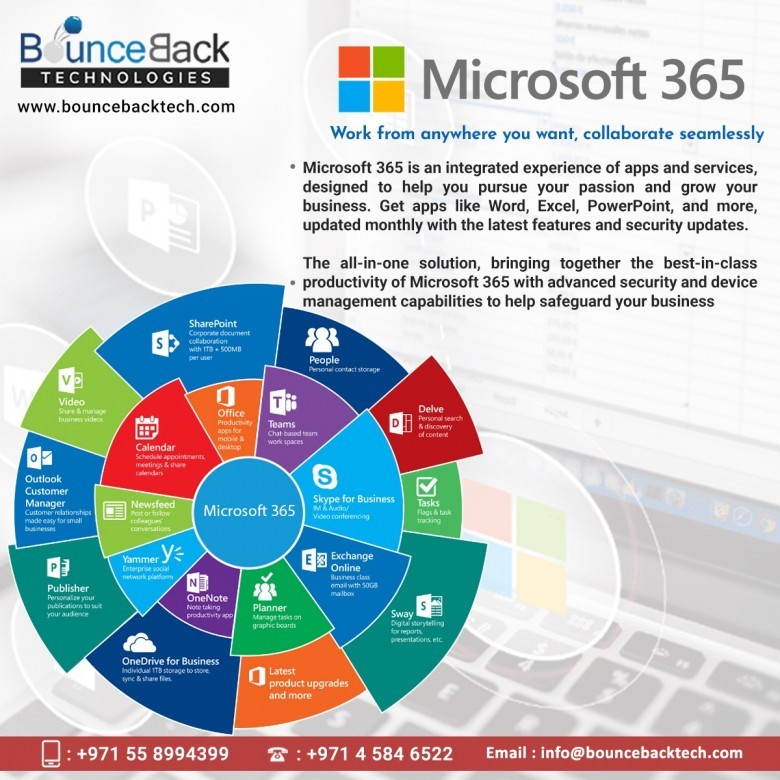 Bounce Back Technologies is a Office 365 Partners in Dubai Office 365 is a line of subscription services offered by Microsoft, as part of the Microsoft Office product line. Bounce Back Technologies offers consultancy for the entire suite of Microsoft Cloud services in UAE.