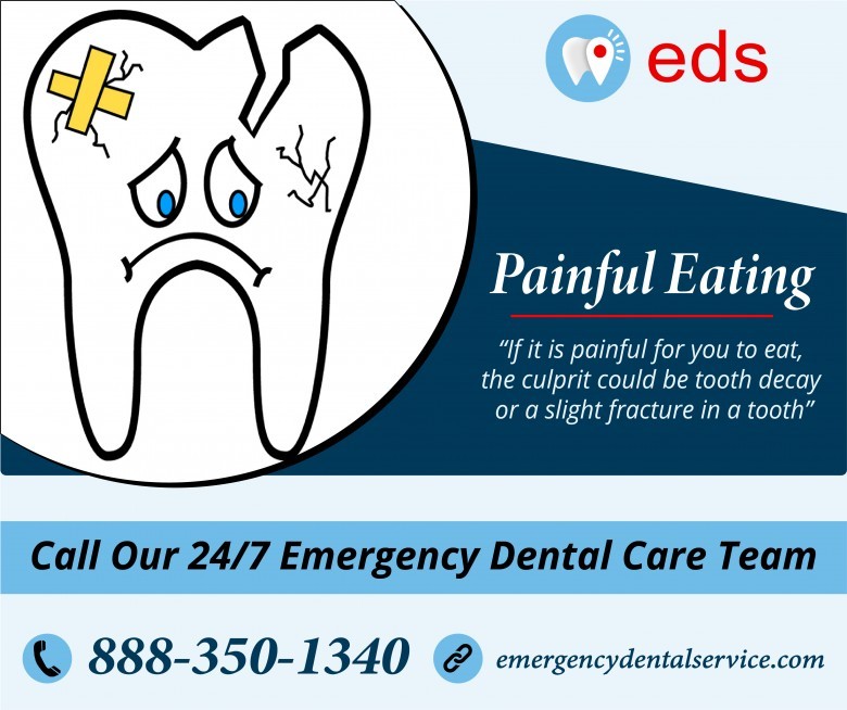 Are you experiencing tooth pain while eating? Is it making you uncomfortable? If yes, painful eating happens because of tooth decay or tooth injury. Call Emergency Dental Service at 1-888-350-1340 today to get rid of the painful eating problem.
