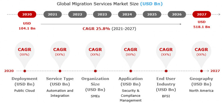 The Migration Services Market size was valued at US$ 104.1 Bn in 2020 and is expected to grow at a compound annual growth rate (CAGR) of 25.8% for the forecast period ending 2027 reaching a Market value of US$ 518.1 Bn.