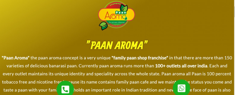 “Paan Aroma“ the paan aroma concept is a very unique “family paan shop franchise“ in that there are more than 150 varieties of delicious banarasi paan. Currently, paan aroma runs more than 100+ outlets all over India. Each and every outlet maintains its unique identity and specialty across the whole state.Check our franchise model : https://indianfoodfranchise.in/paan-aroma/