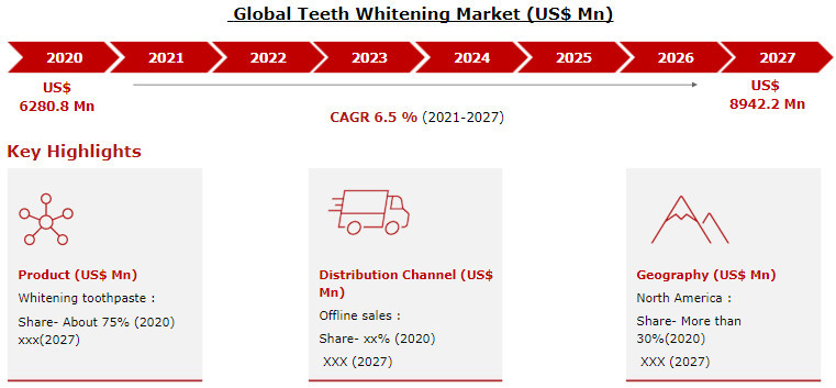 The Teeth Whitening Market size was valued at US$ 6280.8 Mn in 2020 and is expected to grow at a compound annual growth rate (CAGR) of 6.5% for the forecast period ending 2027 reaching a Market value of US$ 8942.2 Mn.