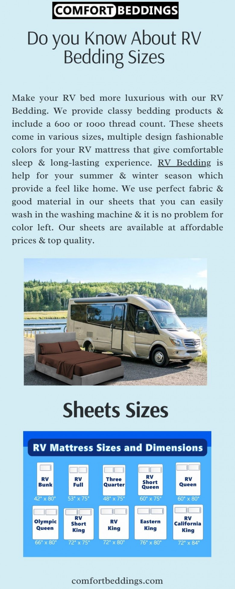 View this infographic & know which size is right for your RV mattress. RV Bedding is made of 1000 thread count & 100% Egyptian cotton. We provide perfect sizes for your RV mattress that perfectly fit in your RV bed.