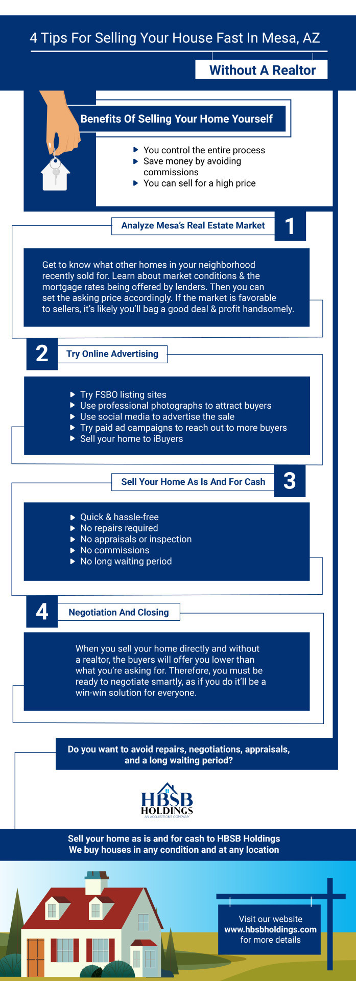 Here are the fastest ways to sell your house in Mesa, AZ and get fair cash without dealing with real estate agents or other traditional home selling hassles. At HBSB Holdings, LLC, we buy properties as is, and we can close a deal within 30 days. We’ll pay in cash at closing and help you move out. Visit https://www.hbsbholdings.com/ to know more about what we do.