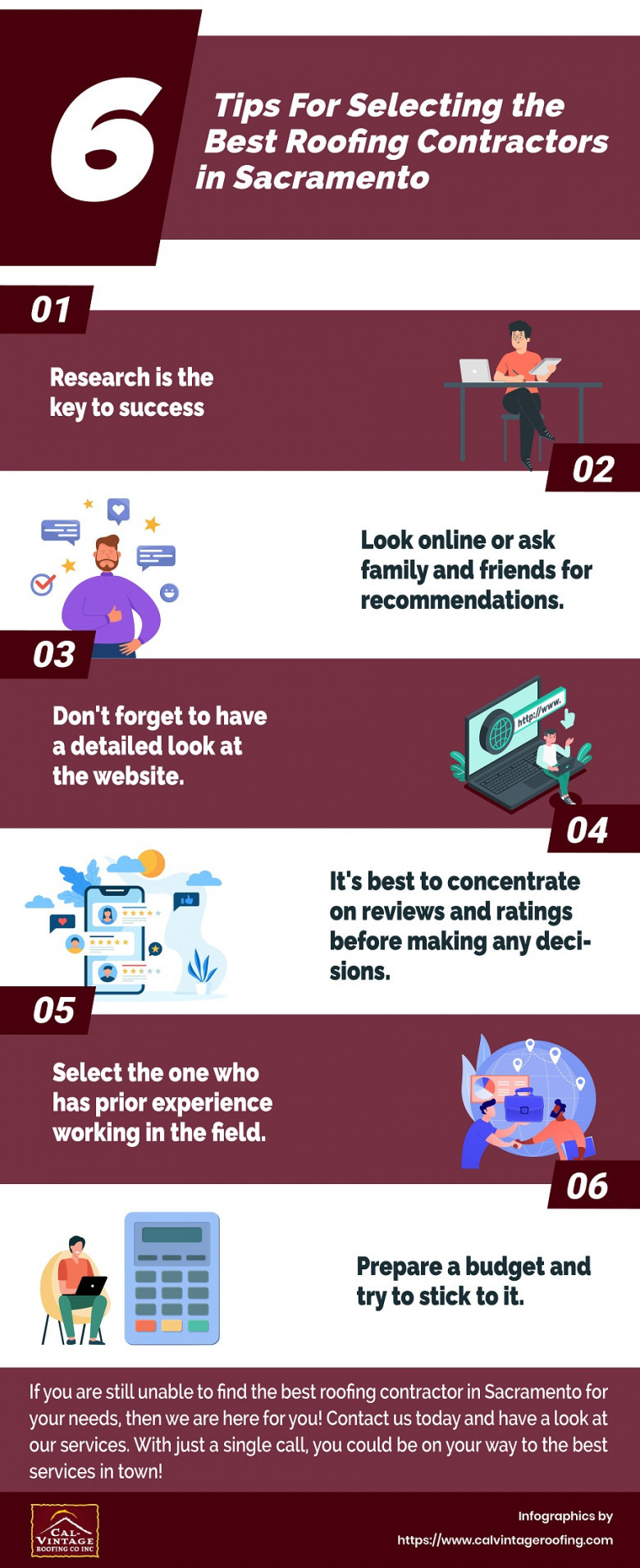 A roof is one of the most important parts of any foundation, and it is quite important to keep it intact no matter what. If you have been facing serious problems with your roof and want to get it fixed before any major damage occurs, you must call the best roofing contractor in Sacramento to fix the issue immediately. For more details, read this infographic: https://www.calvintageroofing.com/tips-for-selecting-the-best-roofing-contractors-in-sacramento/.