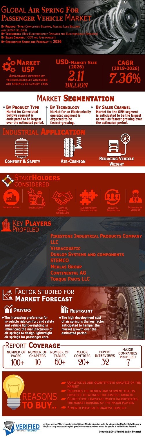 Global Air Spring for Passenger Vehicle Market was valued at USD 1.05 Billion in 2018 and is projected to reach USD 2.11 Billion by 2026, growing at a CAGR of 7.36% from 2019 to 2026.