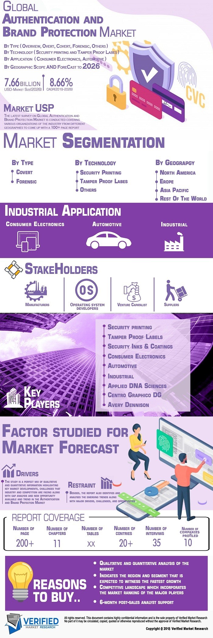 According to Verified Market Research, The Global Authentication and Brand Protection Market was valued at USD 3.94 Billion in 2018 and is projected to reach USD 7.66 Billion by 2026, growing at a CAGR of 8.66% from 2019 to 2026.