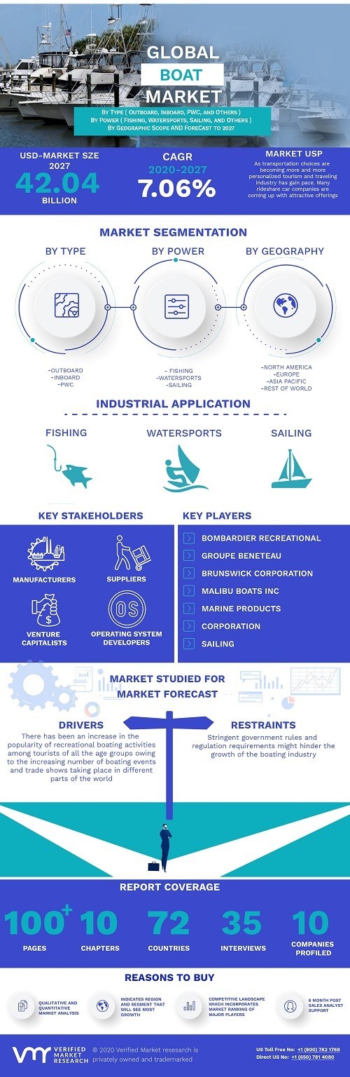 the Global Boat Market was valued at USD 30.56 Billion in 2019 and is projected to reach USD 42.04 Billion by 2027, growing at a CAGR of 7.06% from 2020 to 2027.