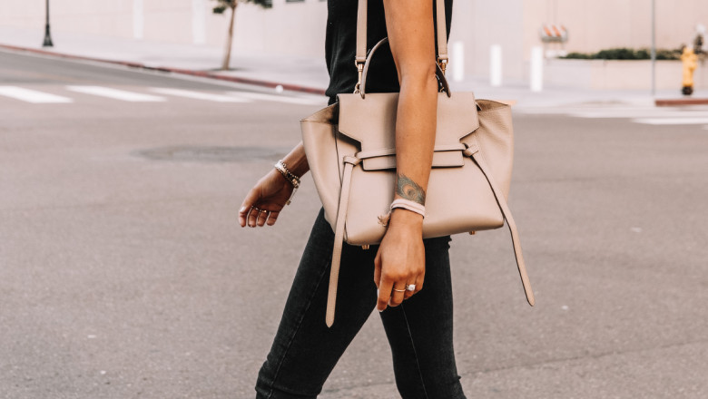 Elegant C茅line Tri-Fold handbag in beige grained leather, hardware in silver metal, double handle in beige leather allowing the bag to be worn in the hand or on the shoulder. Leather link fastener. Lining in beige suede, three compartments and one of them is zipped, two patch pockets.